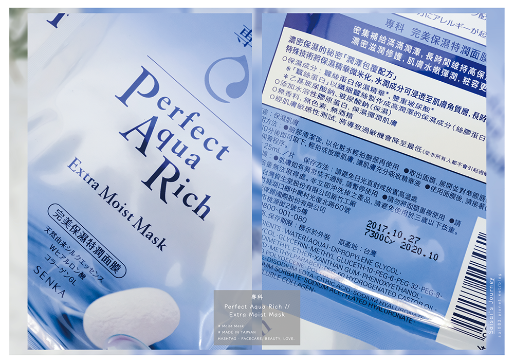 專科完美保濕潤澤面膜,比起化粧水的濕敷來說更持久,到隔天早上都還能感覺得到肌膚的保水度