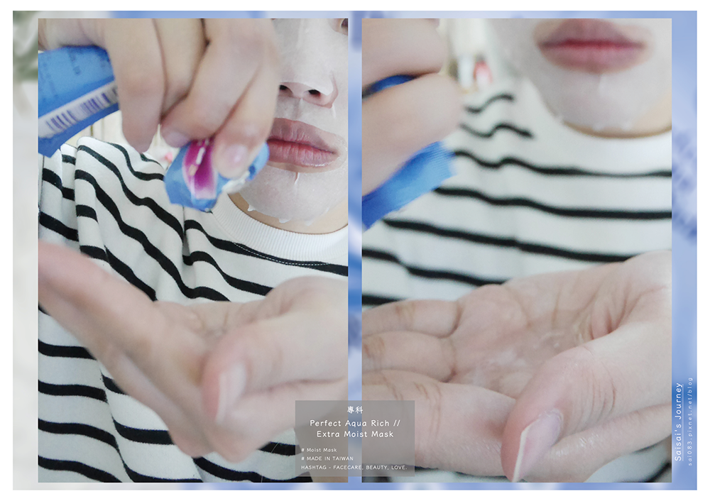 而專科完美保濕特潤面膜裡的精華還有非常的多,當然不能浪費,擠出來後馬上塗抹在面膜上