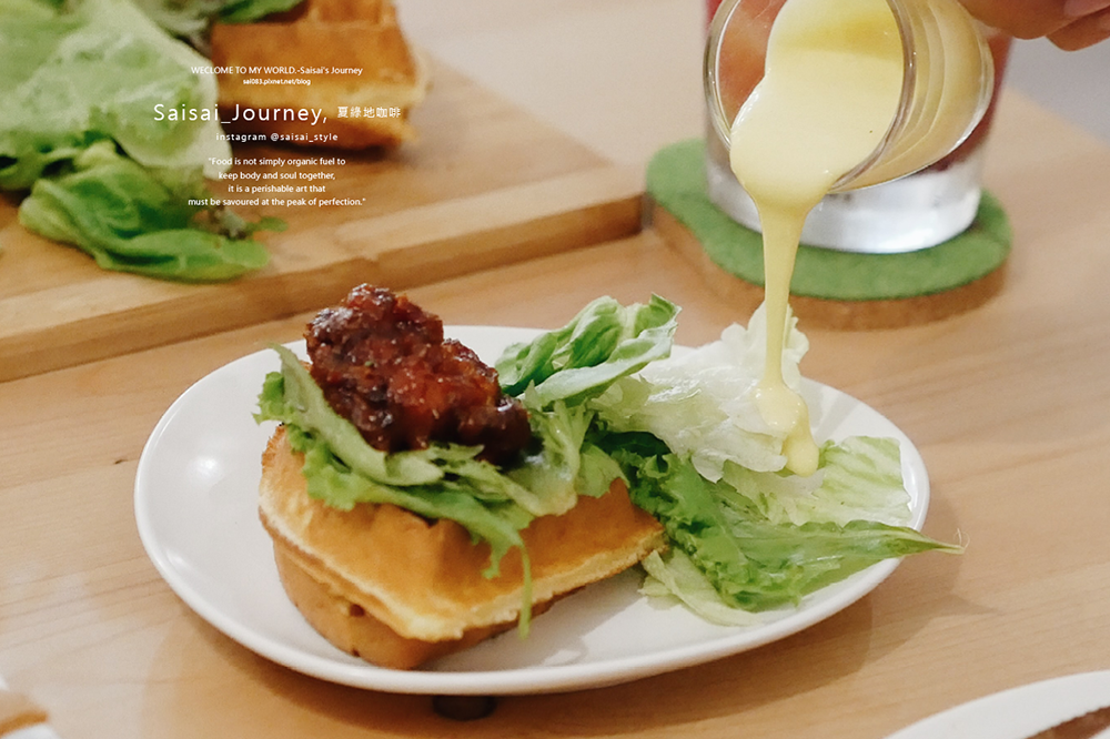 而炸雞的部分使用了雞腿肉去做醃製,口感上比起雞胸肉更好吃,醬料則是搭配了韓式歐巴味酸辣吮指,整體來說有些人會覺得偏鹹,但是搭配上生菜與鬆餅就非常的剛好~