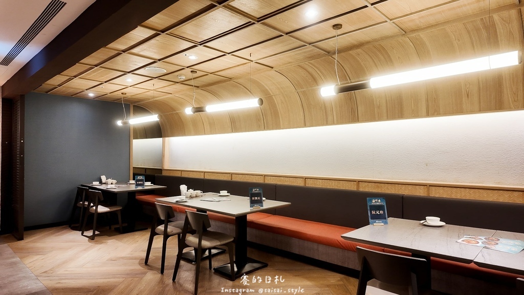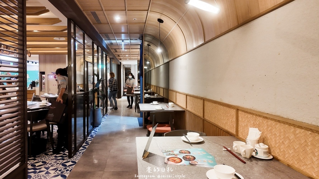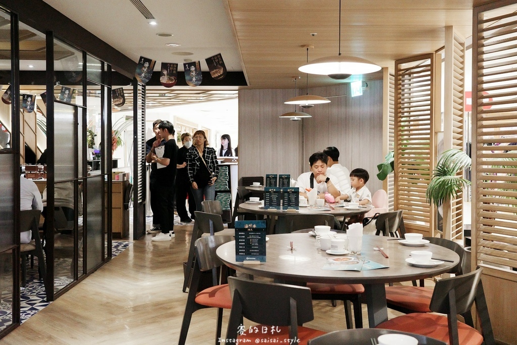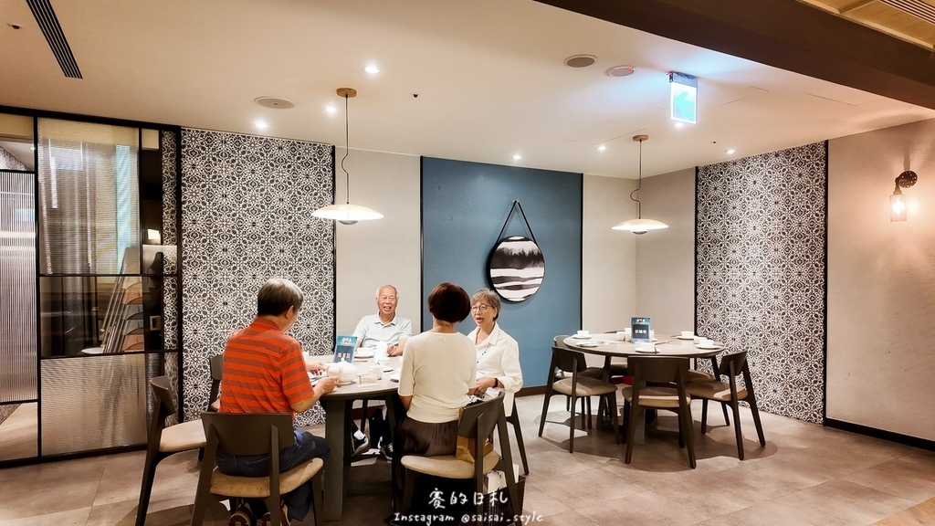 餐廳整體以木質調與藍白幾何地磚,營造出溫潤又現代的氛圍,無論家庭聚餐或朋友聚會都很合適。