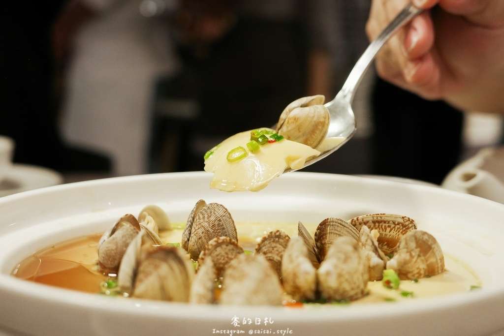 搭配鮮美的花蛤,海味十足、每一口都能嚐到蛤蜊湯汁融入蛋液後的自然鮮甜,上層澆淋的蒸魚醬汁鹹香提味,再加上熱油激發出的蔥香,更讓層次感倍增。