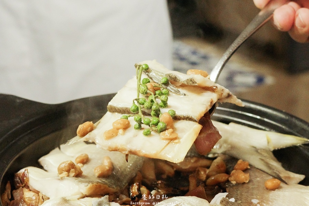 鍋底鋪滿薑片、紅蔥頭與青花椒,透過熱氣蒸煮將辛香料的精華完整釋放,讓魚肉在細火慢煨中逐漸吸附香氣。