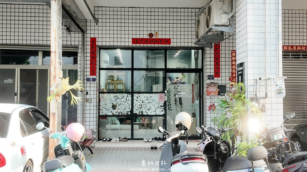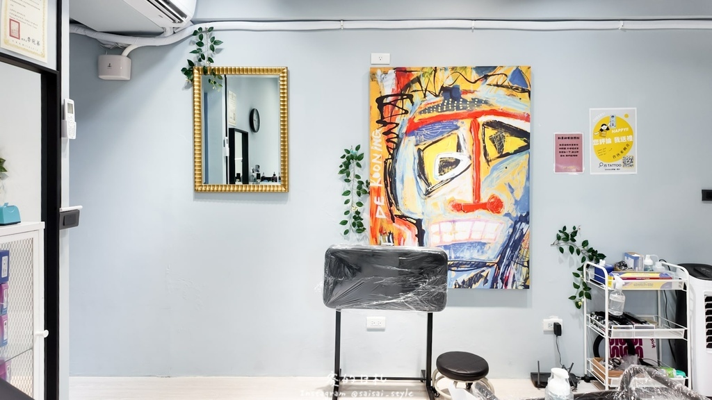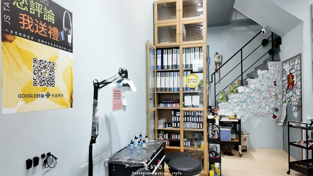 工作區旁有木質層架展示色料和工具,牆面上貼有Google評論活動海報,以及詳細的刺青照護與常見問答(Q&A)資訊,讓顧客能安心且清楚地了解刺青流程。
