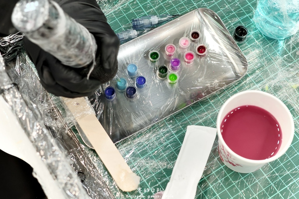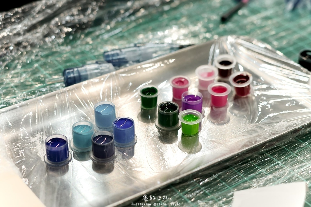 此外,刺青顏料也會依圖案需求調配出多種色彩(如托盤上的藍、綠、紫、紅等色),由於針頭需要最低量的顏料才能正常「吃色」運作,因此每次製作都會有一個基本費用。