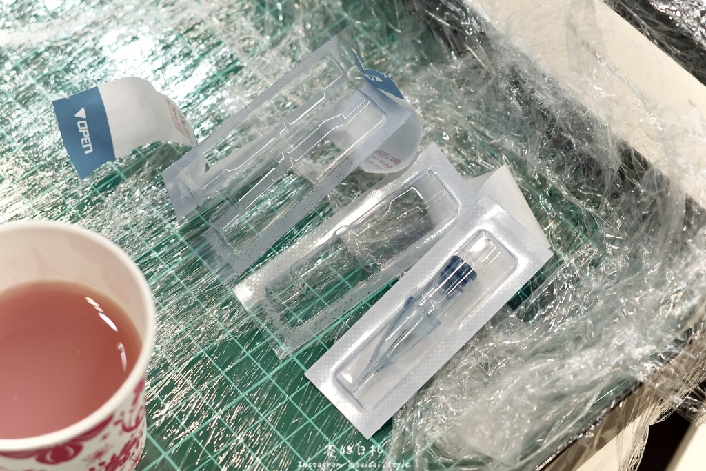 如圖所示,店家使用一次性拋棄式針具(從完整包裝中取出),確保絕對的衛生安全。